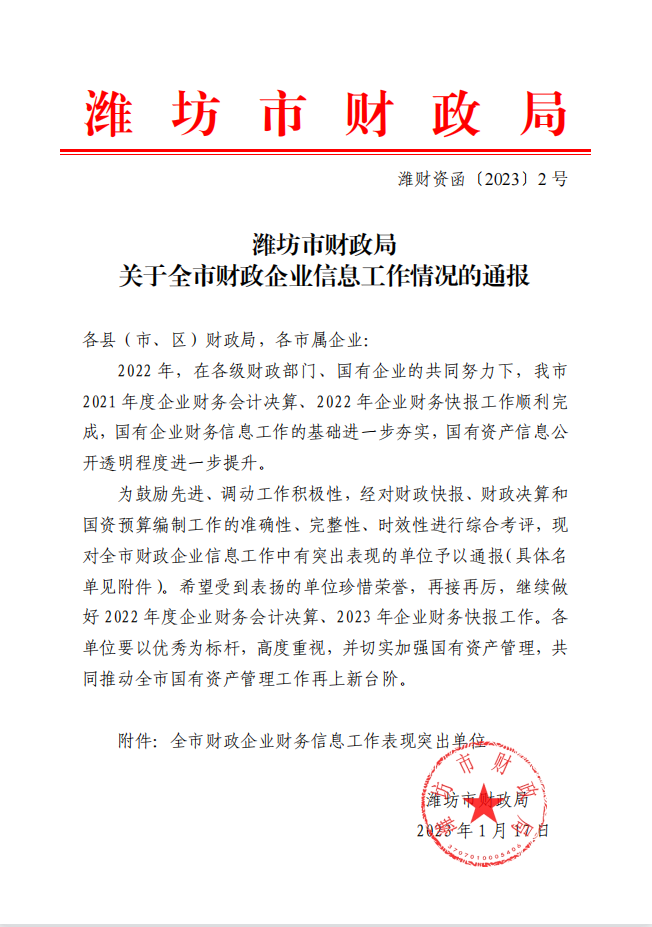近日,濰坊市財政局下發(fā)文件,對全市財政企業(yè)信息工作情況進行通報,我公司榜上有名,連續(xù)兩年被評為“全市財政企業(yè)財務信息工作表現(xiàn)突出單位”。公司歷來高度重視財務管理工作。2022年度一把手親自抓靠,通過會計工作數(shù)字化轉(zhuǎn)型、人才隊伍結(jié)構(gòu)優(yōu)化、會計職能
